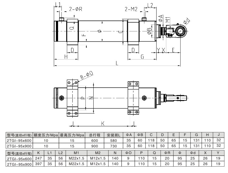 二級(jí)伸縮液壓缸 腳座鏈接外形安裝尺寸圖